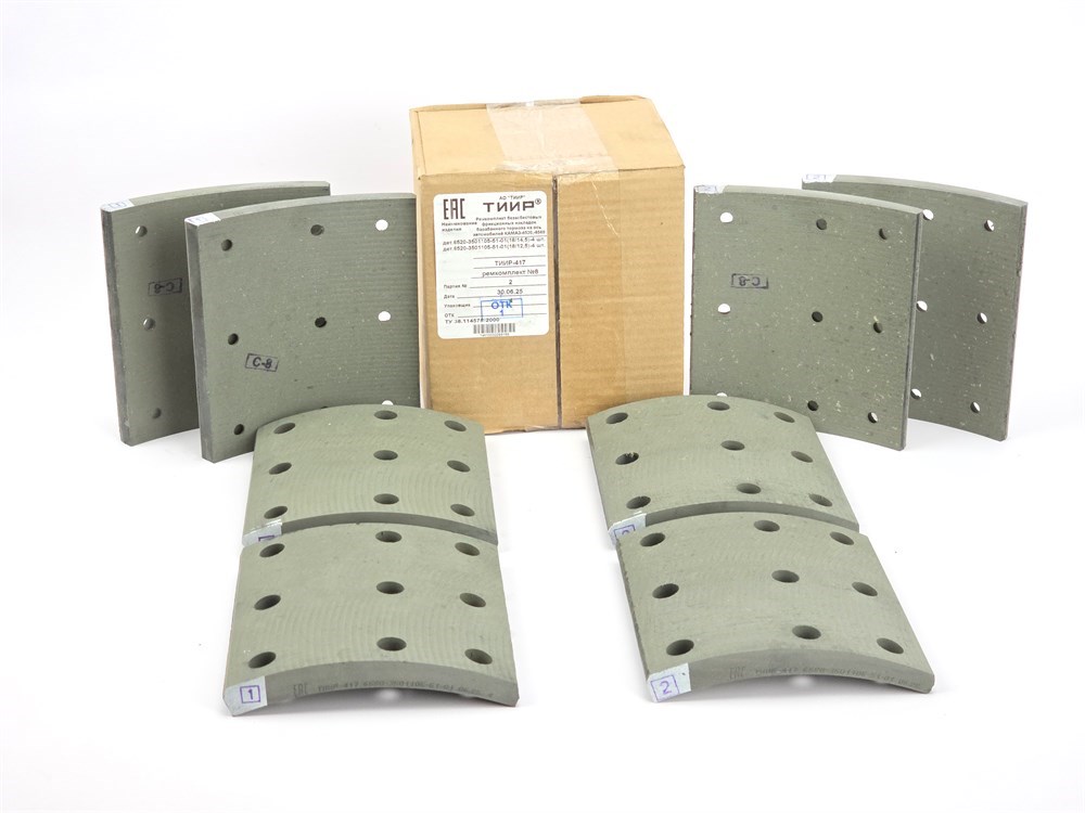 Рем. комплект тормозных накладок а/м КАМАЗ-6520, 6560 ЕВРО после 06.2013 г. (материал ТИИР-417, повышенный ресурс/ Сверл./расточен./без заклёпок/ ширина 180мм., 9 отв./ к-т 8 шт. короткие, 6520-3501105-51-01 / доп арт.: 6520-3501105-К, RU 372 HD, 6580-350