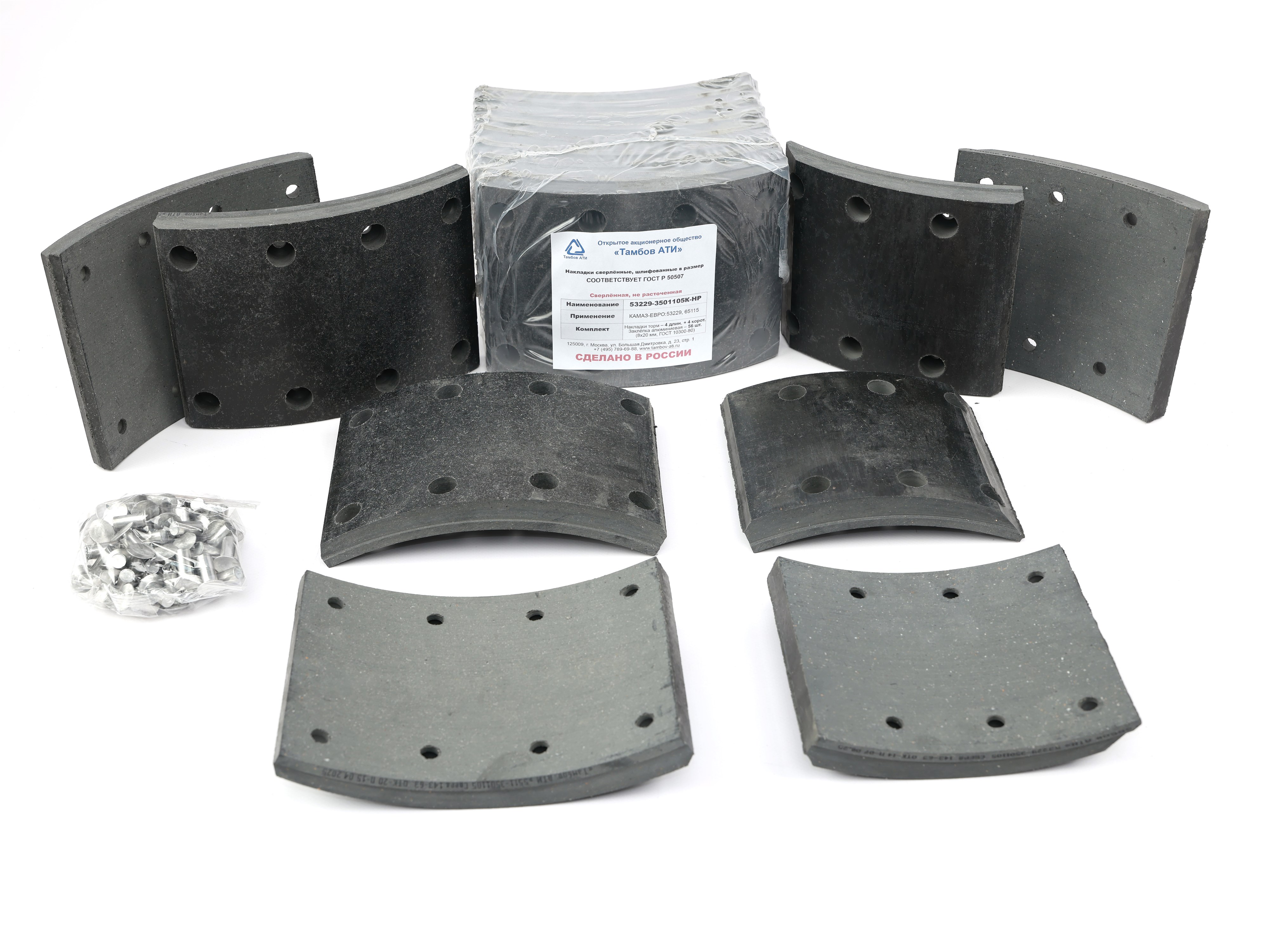 Рем. комплект тормозных накладок а/м КАМАЗ-53229, 53215, 65115, 65117 после 06.2013 г. 4 длинные+ 4 короткие (Сверл./не шлиф/с заклёпками/ширина 140мм./ к-т 8 шт. толст.+тон.) Тамбов АТИ