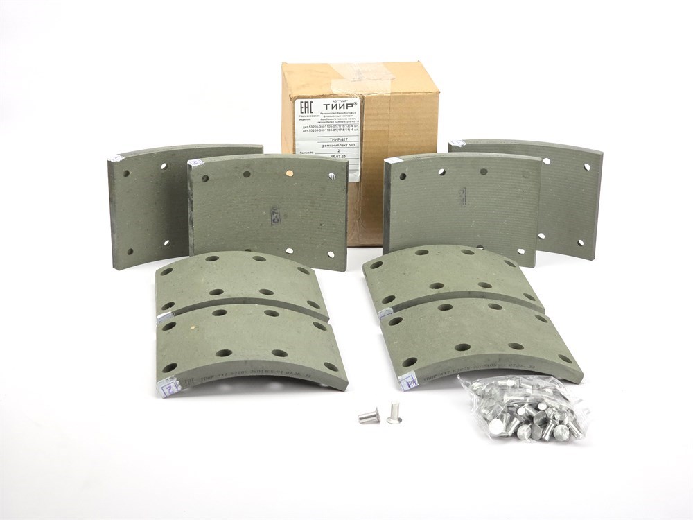 Рем. комплект тормозных накладок а/м КАМАЗ 65115, 65117, 53215 ЕВРО после 06.2013 г. (материал ТИИР-417, повышенный ресурс/ Сверл./расточенные/с заклёпками/ширина 140мм./ к-т 4 длин. + 4 корот., 53205-3501105-01/53205-3501105-51-01 / доп. арт: 53229-35011