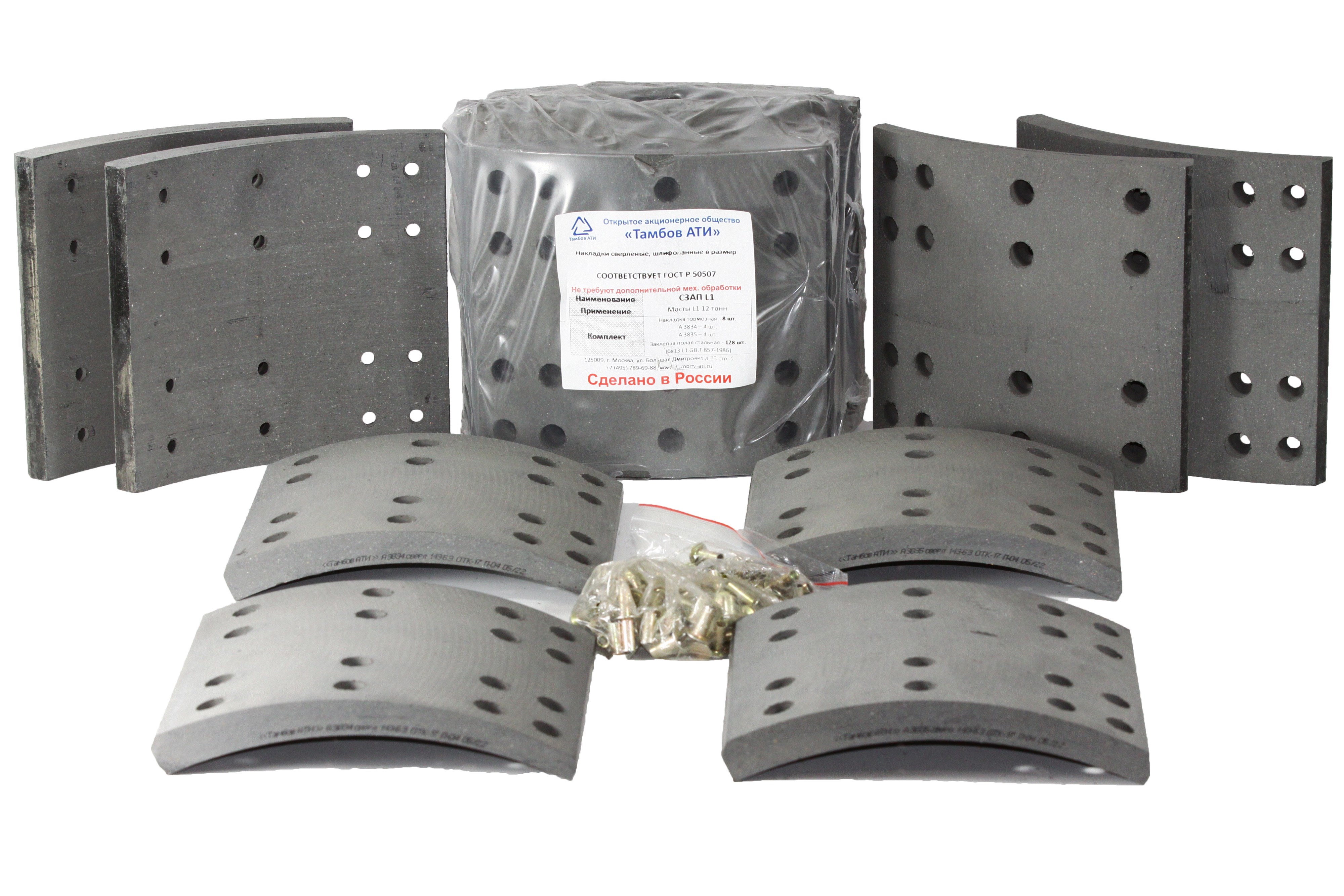 Рем. комплект тормозных накладок на ось: СЗАП L1 12т (к-т 8 шт./сверл./расточ./с заклепками/ширина=180мм.)